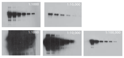 該產(chǎn)品是基于魯米諾開發(fā)的一種非同位素的HRP底物,當(dāng)有H2O2存在時(shí),HRP可催化魯米諾發(fā)光,且這個(gè)反應(yīng)相當(dāng)迅速。該底物檢測(cè)信號(hào)與被檢蛋白濃度呈非常好的正相關(guān)關(guān)系,靈敏度高達(dá)pg級(jí)別。此外,反應(yīng)物可從膜上洗去,然后重新加入底物反應(yīng),如此進(jìn)行實(shí)驗(yàn)結(jié)果的優(yōu)化而不再需要重復(fù)全部WB過程。LumiGLO Reserve是對(duì)LumiGLO的第二代升級(jí)產(chǎn)品,可檢測(cè)pg-fg級(jí)(HRP g/ml)