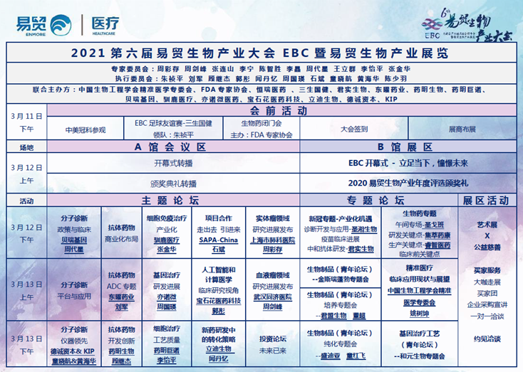 2021第六屆易貿(mào)生物產(chǎn)業(yè)大會(huì)EBC將于3月11-13日在蘇州國(guó)際博覽中心隆重召開。EBC 2020年參會(huì)人數(shù)2724人,2021年將突破4000人規(guī)模,參會(huì)人群覆蓋創(chuàng)業(yè)者、科學(xué)家、臨床醫(yī)生、投資人和供應(yīng)商等。同期開展的易貿(mào)生物產(chǎn)業(yè)展覽,將有超過200家儀器、耗材、服務(wù)等供應(yīng)商展出,會(huì)+展聯(lián)動(dòng)的EBC,已成為國(guó)內(nèi)外生物產(chǎn)業(yè)高層交流與合作的標(biāo)桿平臺(tái)。
