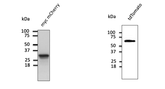 ? ? 西美杰代理SICGEN品牌提供的Anti-mCherry和Anti-tdTomato均為從圓盤珊瑚中提取的紅色熒光蛋白的多克隆抗體。Anti-mCherry和Anti-tdTomato兩種抗體的抗原均是大腸桿菌表達(dá)的重組多肽純化而來,用Western blot檢測轉(zhuǎn)染了兩種蛋白的HEK293細(xì)胞,分別可檢測到29kda和55kda的條帶。Anti-tdTomato抗體對tdTomato和mCherry均有特異性,但與綠色熒光蛋白(GFP)不發(fā)生交叉反應(yīng)。???????????