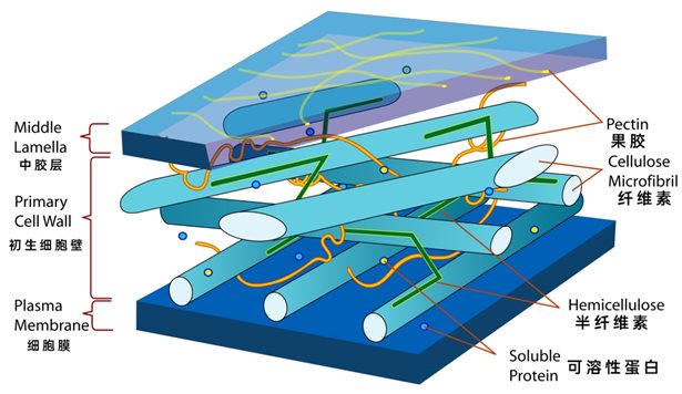 植物細(xì)胞壁由胞間層、初生壁和次生壁構(gòu)成。胞間層又稱中膠層,其主要成分為果膠質(zhì),用于將相鄰細(xì)胞粘連在一起,并可緩沖細(xì)胞間的擠壓。初生壁是由原生質(zhì)體分泌形成的細(xì)胞壁,位于胞間層內(nèi)側(cè),通常較薄,具有較大的可塑性,可使細(xì)胞保持一定形狀,又能隨細(xì)胞生長而延展。次生壁是植物細(xì)胞停止生長后,其初生壁內(nèi)側(cè)繼續(xù)積累的細(xì)胞壁層,位于質(zhì)膜和初生壁之間,通常較厚,約5~10微米,而且堅硬,使細(xì)胞壁具有很大的機(jī)械強(qiáng)度。有研究人員發(fā)現(xiàn)細(xì)胞壁上微纖絲的排列方向各層很不一樣,一般初生壁上的微纖絲多呈不規(guī)則交錯的網(wǎng)狀,而在次生壁上則往往比較有規(guī)則。