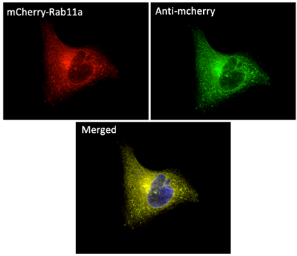 MCR細(xì)胞轉(zhuǎn)染表達mCherry-Rab11a后用甲醇固定并用1/250稀釋的anti-Rab11a抗體和anti-mCherry抗體做免疫熒光結(jié)果
