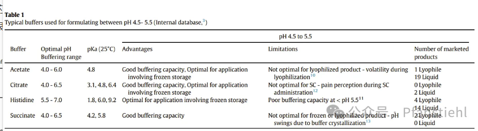 盡管在液體和凍干產(chǎn)品中,組氨酸在pH 5.5至6.5的范圍內(nèi)都占據(jù)主導地位,但如果目標pH值在4.5至5.5之間,我們依然還有另外三種緩沖液可選,即醋酸鹽、檸檬酸鹽和琥珀酸鹽。這些緩沖物質(zhì)存在某些固有的挑戰(zhàn),阻礙了它們在靜脈和皮下給藥以及液體和凍干劑型方面的廣泛使用。而組氨酸的pKa值為6,在pH<5.5時緩沖性較差,因此在4.5至5.5的pH范圍內(nèi)應用有限。雖然醋酸鹽在此范圍內(nèi)具有良好的緩沖能力,但其易揮發(fā)和冷凍干燥過程中溶劑的過度損失是其應用相關的潛在挑戰(zhàn)。檸檬酸鹽緩沖制劑在皮下應用中使用有限,原因是在皮下注射期間存在壞死的風險。琥珀酸鹽在pH4.5至5.5之間提供了強大的緩沖能力,但由于琥珀酸鹽結(jié)晶影響產(chǎn)品穩(wěn)定性而導致pH值劇烈波動的風險,通常避免其用于冷凍或凍干的應用。以下表格總結(jié)了在注射制劑中使用這四種緩沖液的局限性[1]。