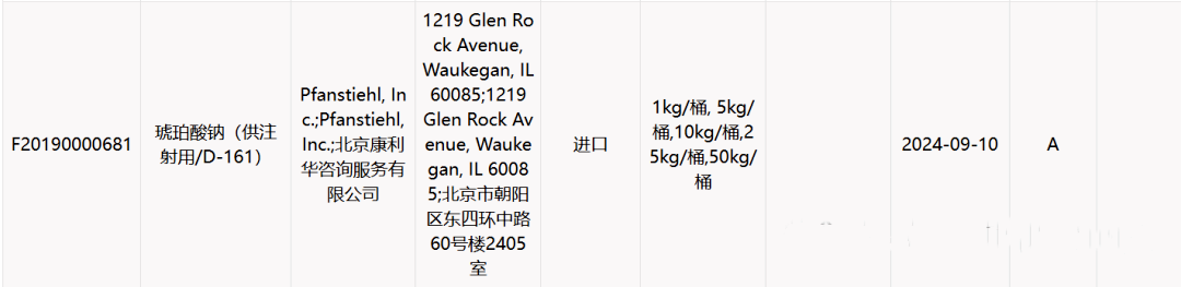 “ 熱烈祝賀Pfanstiehl品牌六水合琥珀酸鈉(供注射用/D-161)CDE注冊(cè)登記號(hào)F20190000681已激活!”