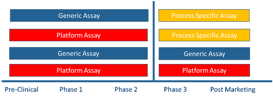USP<1132>提到在沒(méi)有平臺(tái)化方法的情況下可以在臨床前、臨床I期、II期使用商品化試劑盒;在臨床III期/工藝驗(yàn)證及產(chǎn)品上市后,由于商業(yè)化的通用HCP檢測(cè)試劑盒抗體的覆蓋率往往不足等局限性,需要考慮結(jié)合細(xì)胞類型及工藝特異性等因素,使用平臺(tái)化方法或針對(duì)上游工藝開(kāi)發(fā)的產(chǎn)品/工藝專屬性方法。