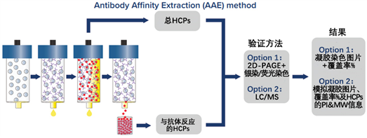 AAE分析流程首先將多克隆抗體共價(jià)固定在色譜柱上。然后對(duì)色譜柱進(jìn)行條件調(diào)節(jié),以防止抗體的顯著浸出并極大地減少任何非特異性結(jié)合。原始未變性的HCPs樣品通過(guò)色譜柱與抗體進(jìn)行結(jié)合,隨后用酸洗脫。通過(guò)結(jié)合和洗脫,HCPs樣品再次在柱上循環(huán),直到?jīng)]有其他HCPs被結(jié)合。所有收集的HCPs洗脫液再匯集、交換緩沖液并濃縮回原始樣品體積,為后續(xù)的分析提供高質(zhì)量的樣本。在收集到HCPs樣本后,可以選擇通過(guò)2D-PAGE+銀染或MS質(zhì)譜進(jìn)行后續(xù)分析。