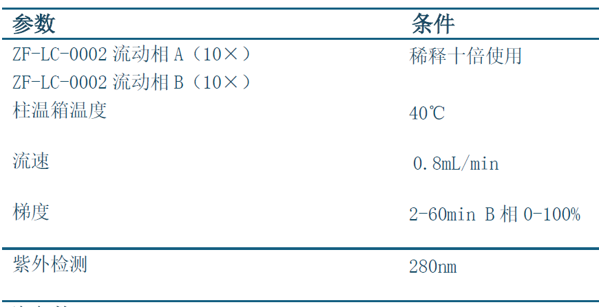 下表列出了使用ZF-LC-0002流動(dòng)相A&B(10×)進(jìn)行IEC-HPLC液相分析的色譜參數(shù):