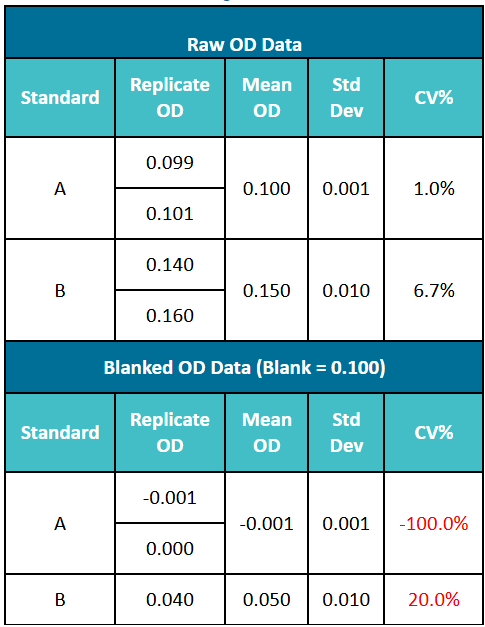 以下示例說明了背景值扣除對(duì)變異系數(shù)的影響。在表1中,標(biāo)準(zhǔn)A的平均OD值為0.100,標(biāo)準(zhǔn)B的平均OD值為0.150 。當(dāng)通過原始讀數(shù)減去空白對(duì)照的OD值來計(jì)算變異系數(shù)(CV)時(shí),CV值顯著上升,導(dǎo)致標(biāo)準(zhǔn)B的CV%從6.7%增加至20%。
