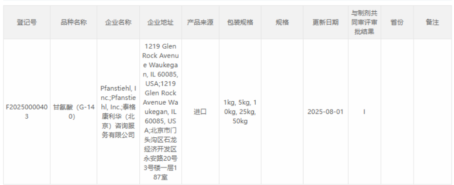 “熱烈祝賀Pfanstiehl的注射級甘氨酸Glycine(G-140)喜獲CDE登記號F20250000403, 這是Pfanstiehl產(chǎn)品獲得的第18個(gè)CDE登記號!”