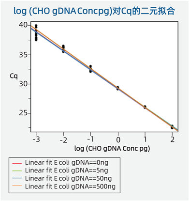 In the Presence of Exogenous DNA, CHO Primers/Probes Still Exhibit a Broad Linear Range and Specificity. E. coli DNA at different concentrations does not affect the standard curve of CHO DNA (see the figure below).