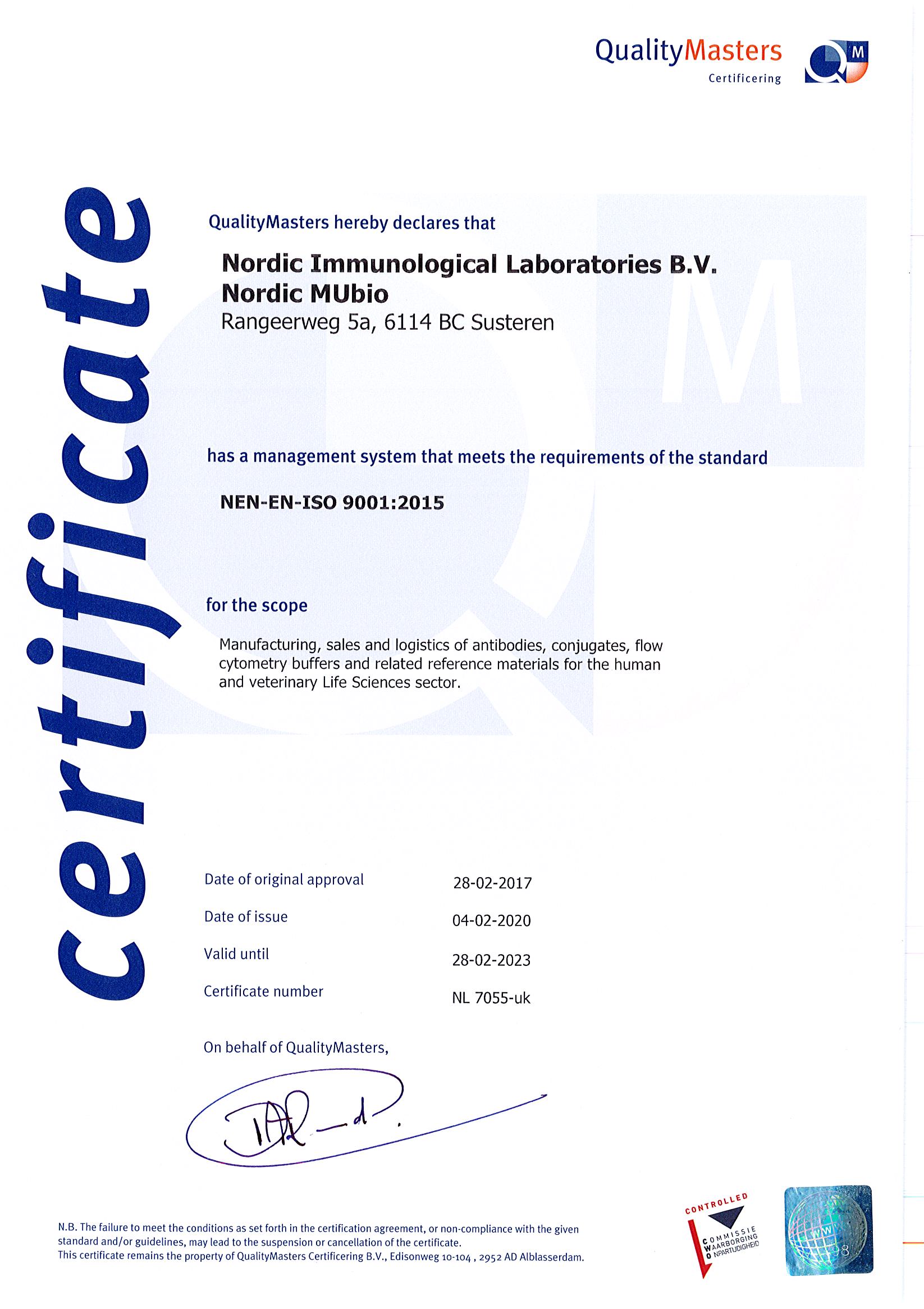 Nordic-MUbio公司供應2000多種用于生物醫(yī)學和獸醫(yī)研究的基礎免疫學試劑,包括抗血清、抗體、免疫復合物、純化蛋白、對照品、血清蛋白標準品和其他校準品。他們包括高度特異性的單克隆抗體,以及用于不同試驗體系的標記二抗。Nordic-MUbio嚴格遵守IS09001標準生產(chǎn)高質(zhì)量的抗體,80%以上的抗體經(jīng)過冷凍組織免疫組化檢測,近70%的產(chǎn)品通過流式細胞術驗證,50%的產(chǎn)品通過WB驗證。同時Nordic-MUbio也是斑馬魚抗體開發(fā)的引領者,擁有50多種可用于斑馬魚熒光檢測的抗體。Nordic-MUbio的核心優(yōu)勢在于每一個單項產(chǎn)品都提供及時的技術支持并擁有廣泛的科學數(shù)據(jù)、圖片和文獻參考資料。